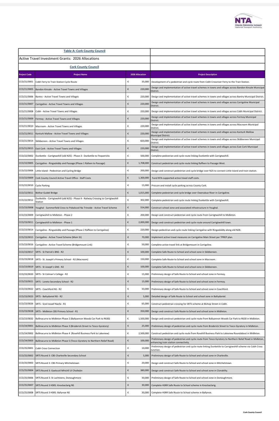 - Active Travel within Towns and Villages in Bandon/Kinsale Municipal District (which includes Crossbarry) – €220,000