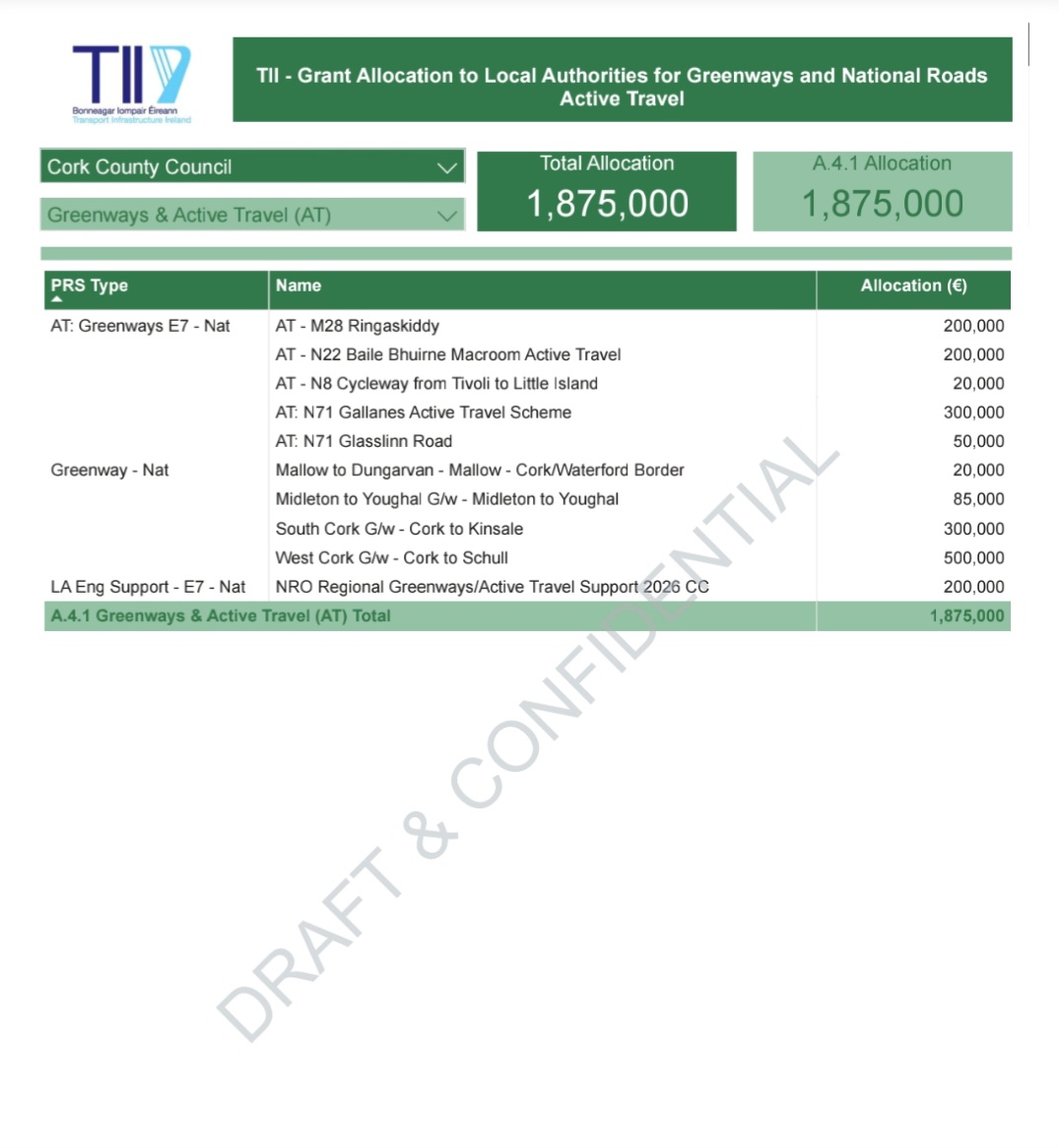 Very welcome news this morning with confirmation by the Minister of State in the Department of Transport Jerry Buttimer, along with his Government Department colleagues, has announced €360 million in Government funding for Active Travel and Greenways in 2026.